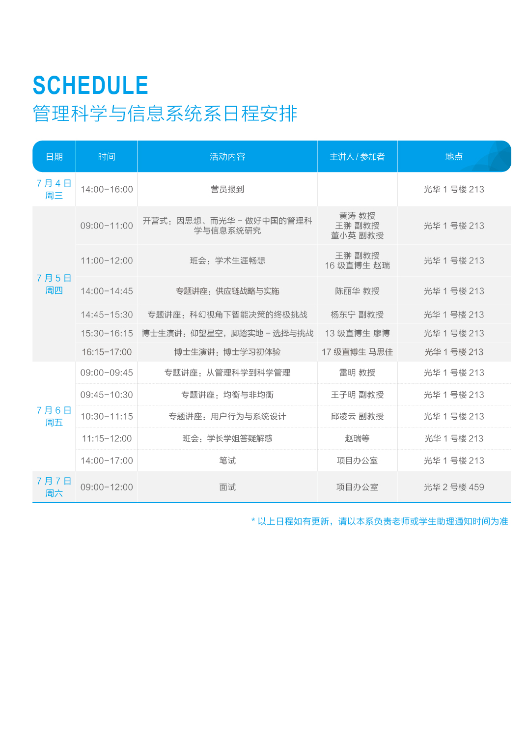希望在夏令营中,,,,,,,各人能更多地相识学科知识和万利官网管理学院,,,,,,,并通过和天下各地优异同龄人的交流,,,,,,,结交良友,,,,,,,并发明自己唯一无二的价值,,,,,,,学有所成、学有所用、造福社会!